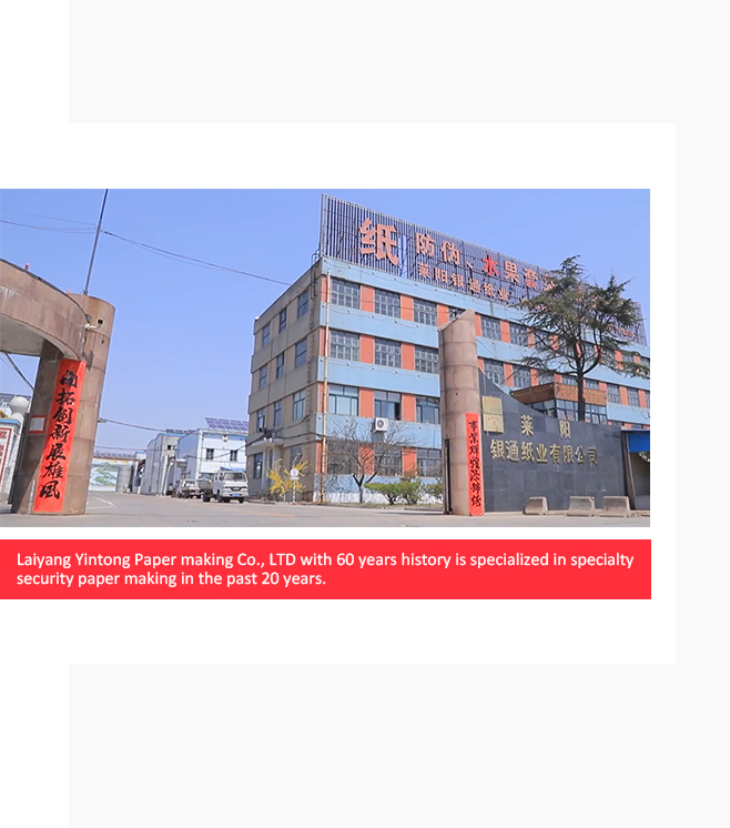 Laiyang Yintong Paper making Co., LTD is a security paper mill established in 2003 in Laiyang,Shandong,China.