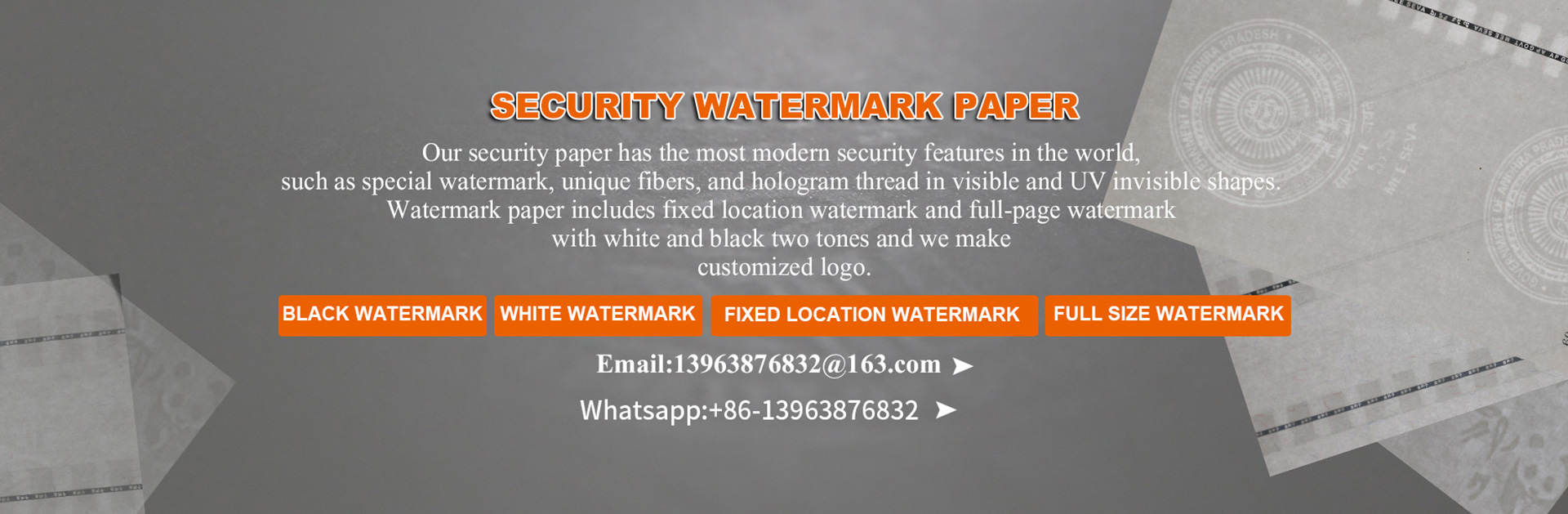 Watermark paper includes fixed location watermark and full-page watermark with white and black two tones and we make customized logo.